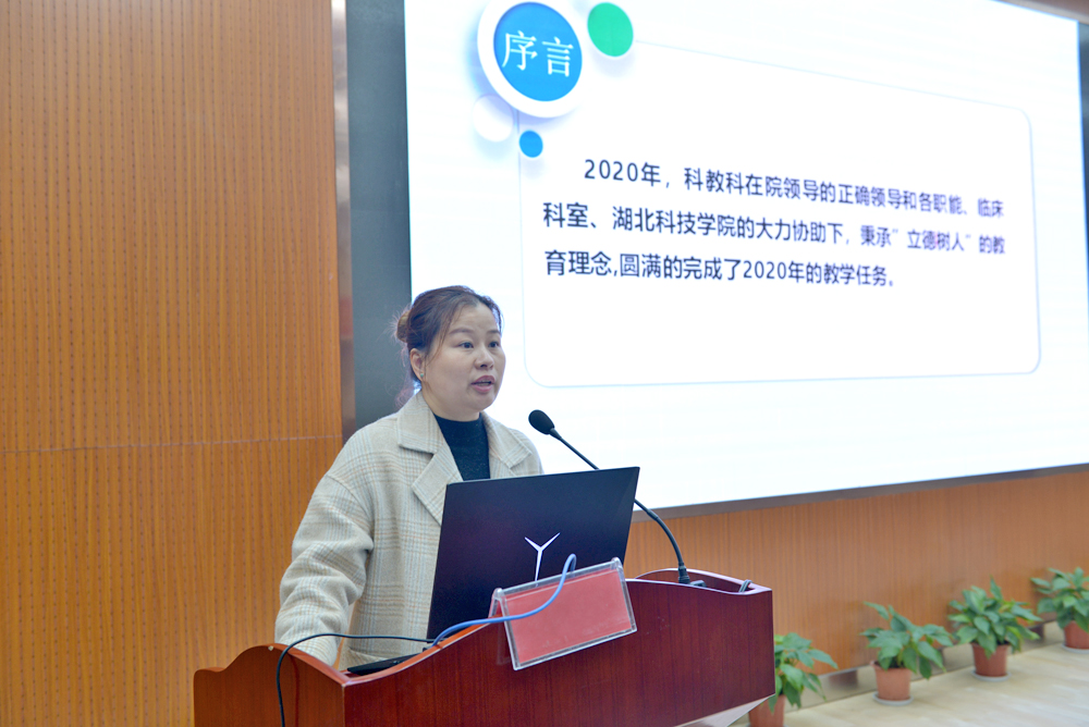 科教科副科长王利红、曾曼丽分别对2020年教学、住培工作及2021年的工作计划做了汇报。她们展示了2020年教学、住培的很多亮点,也提出了一些不足,一张张图片,一组组数据、深入浅出地分析了目前教学、住培工作现状,也给在场所有教学工作者带来思考,路漫漫其修远兮,吾将上下而求索?